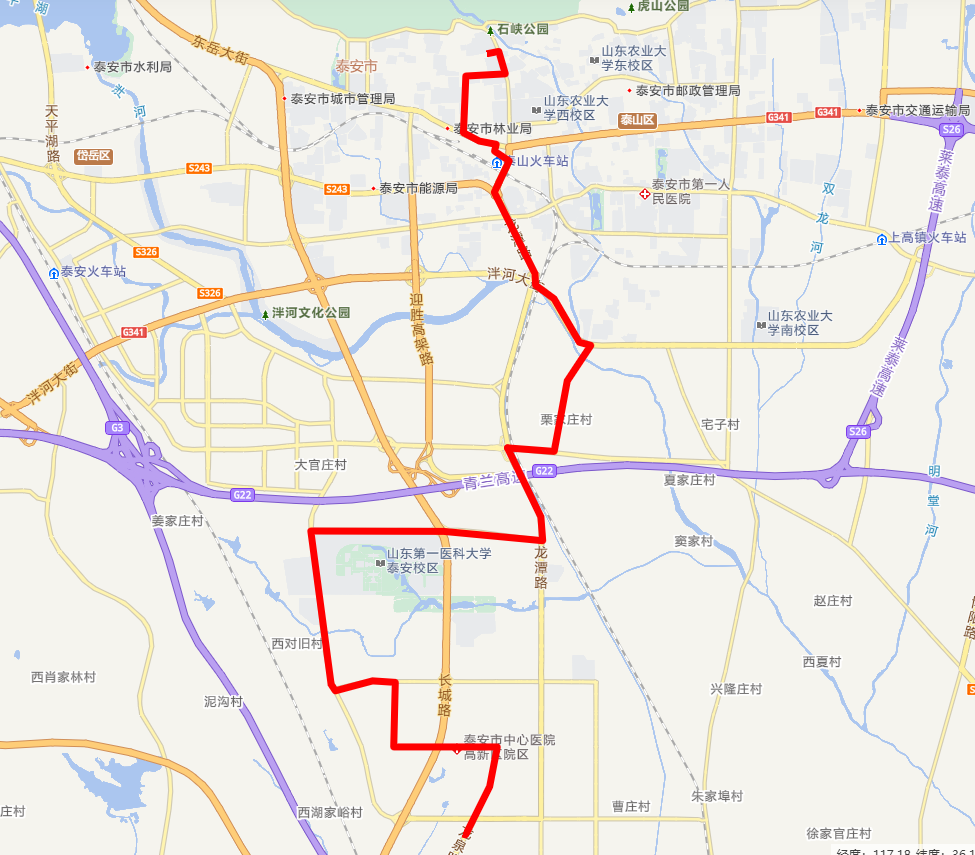 優(yōu)化調(diào)整后30路首末站變?yōu)樯硯X石敢當(dāng)小鎮(zhèn)和山東農(nóng)業(yè)大學(xué)泮河校區(qū)。運行路線為沙嶺石敢當(dāng)小鎮(zhèn)—開明路—大津口鄉(xiāng)—泰明路—天燭峰路—靈山大街—上高東路—泮河大街—山東農(nóng)業(yè)大學(xué)泮河校區(qū);山東農(nóng)業(yè)大學(xué)泮河校區(qū)—泮河大街—上高東路—靈山大街—天燭峰路—泰明路—大津口鄉(xiāng)—開明路—沙嶺石敢當(dāng)小鎮(zhèn)。優(yōu)化調(diào)整后運行路線圖如下:
